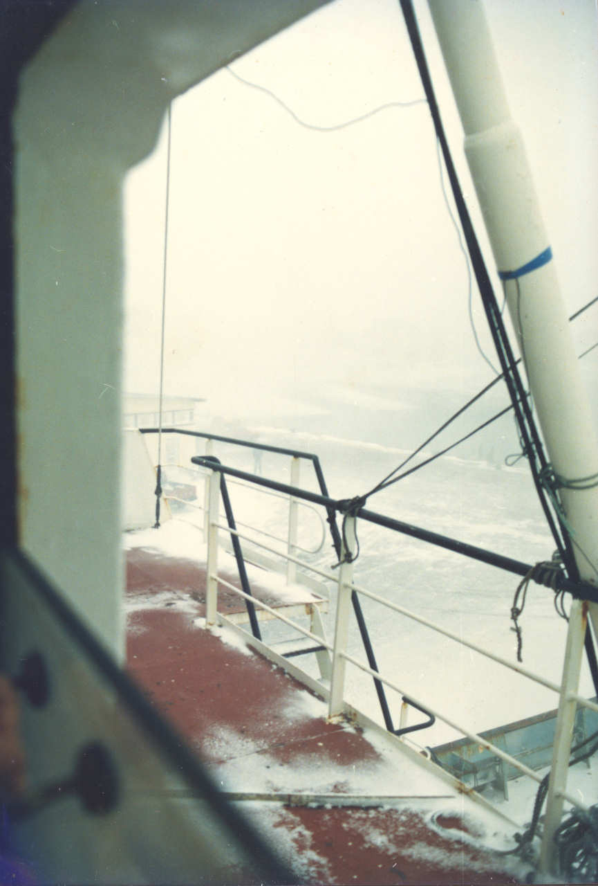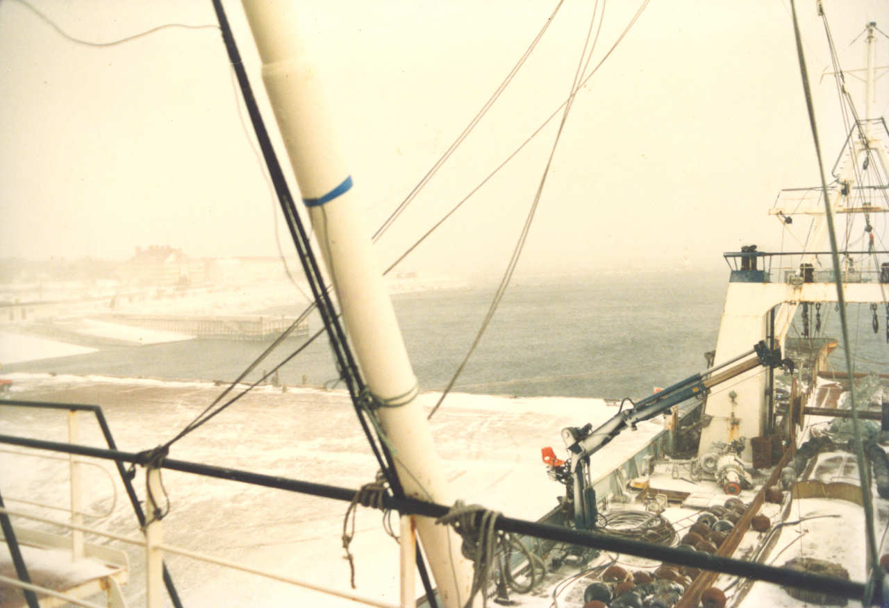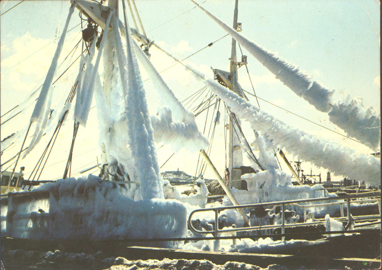 Barcos cobertos de gelo no porto de Saint-Pierre. Consultar o link