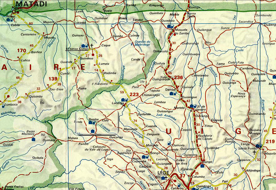 Em destaque, no rectângulo central, as localidades à volta de Bembe: Culo, Tenda e Tôto.
