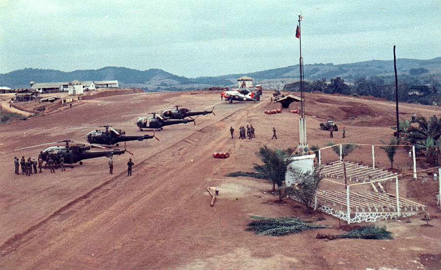 Vista da pista, com os vários helicópteros de origem francesa (Alouette) utilizados pelo exército português.