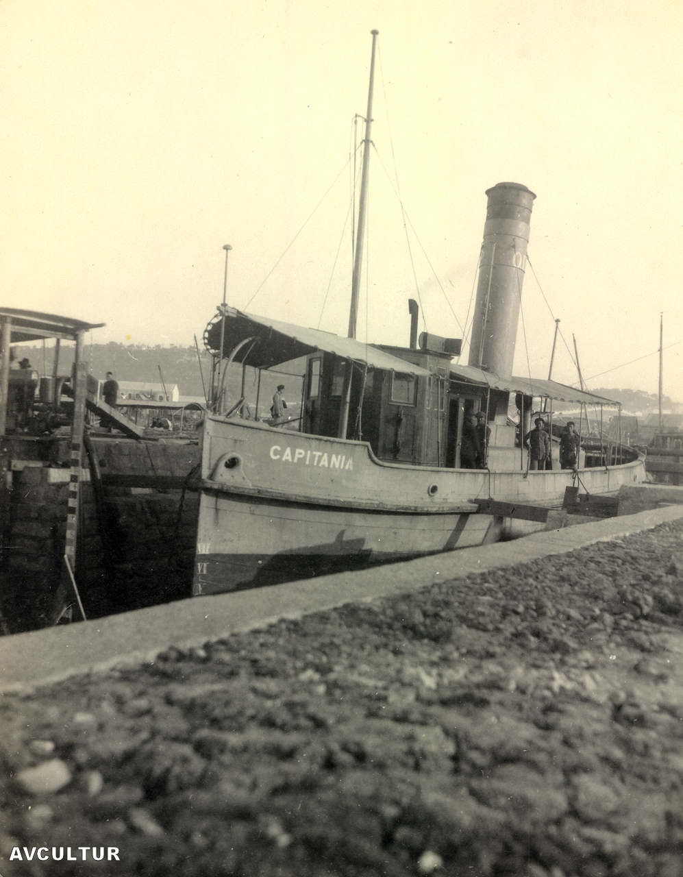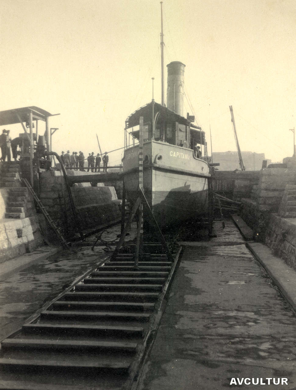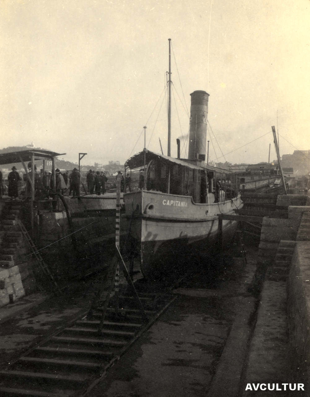 4. Estaleiros navais. Barco em manutenção na doca seca. Década de 1920. As fotos 4 a 9, colocadas pelo organizador do álbum entre as de Lourenço Marques e Serra da Estrela, deveriam estar no grupo pertencente a Macau. Em que é que nos baseamos para fazer esta afirmação? Em primeiro lugar, o formato e a qualidade de papel iguais às das fotos de Macau. E o elemento que acaba por confirmar esta hipótese está na foto 6.