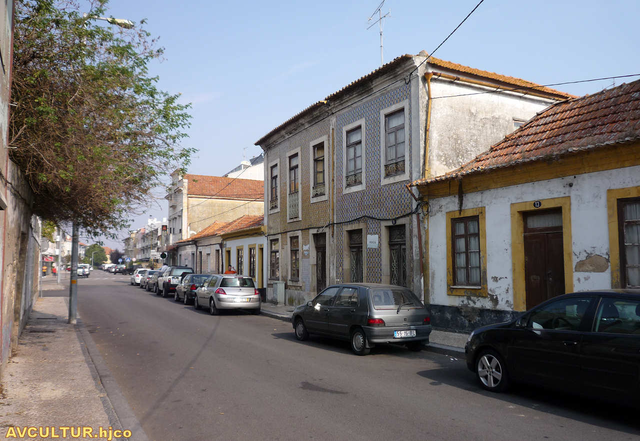 27. Panorâmica da zona em 2008, onde fica a actual praceta João Sarabando. Quase ao centro, o café Convívio, onde, durante vários anos, se reuniu a Tertúlia João Sarabando, após a morte em 1996 deste jornalista aveirense. À direita, com azulejos verdes, a mercearia já encerrada do Sr. Azevedo. Por detrás, com cinco janelas, a casa onde morou João Sarabando. (Imagem em alta resolução. Clicar para ampliar.)