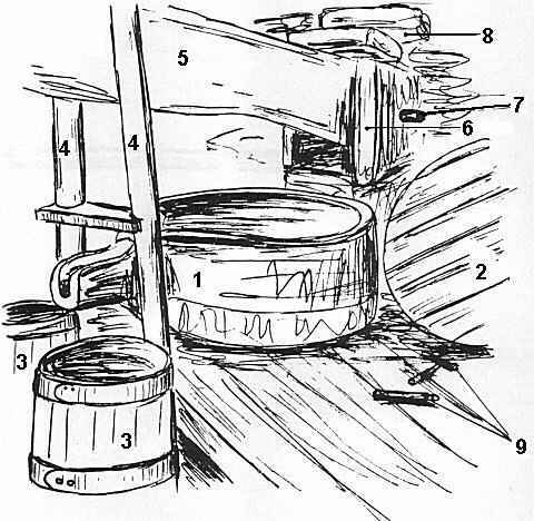 Figura 11: Sertã, potes e outros elementos para a prensagem. Lagar de Canelas de Baixo, concelho de Arouca. Legenda: 1-sertã   2-trincho  3-potes 4-balaústes  5-vara   6-virgens    7-agulha   8-tacos de madeira   9-frades