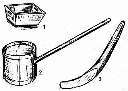 para transporte da água quente; 3-colher de madeira para mexer o bagaço