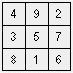 Pedia-se a construção de um quadrado mágico de ordem 3 com os números 1, 2, 3, 4, 5, 6, 7, 8 e 9. Aqui está um com constante mágica 15: