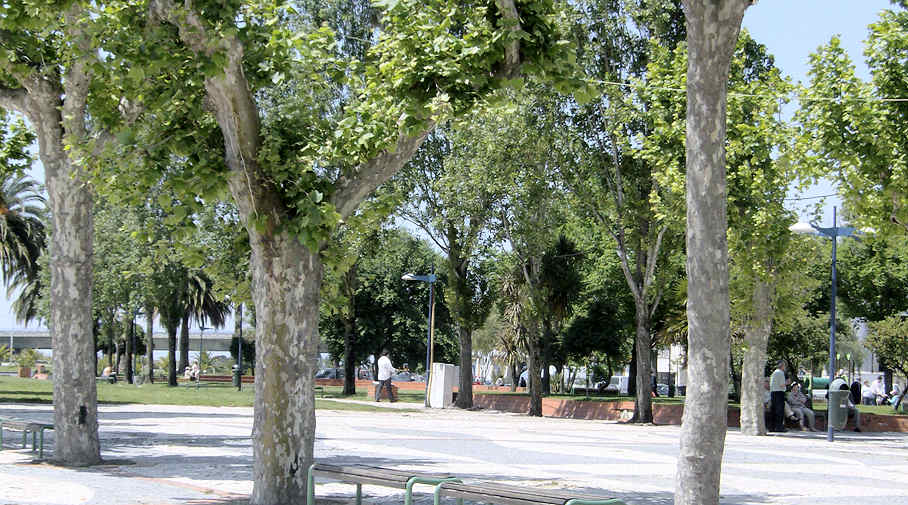 outra praça com pessoas e cores vegetais. Na rua dos Combatentes, as cores estão