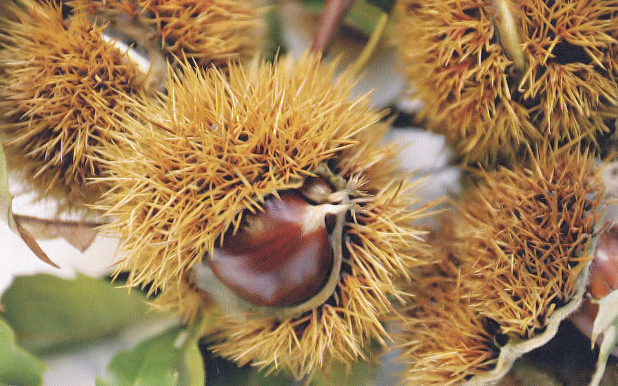 com ele nos ramos carregados de ouriços. As castanhas comem-se cruas,