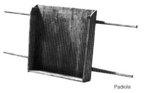 Tabuleiro de 80 x 80 cm., com guardas em três lados e 4 braços de 50 cm., a que pegam duas pessoas; emprega-se na remoção das lamas e do moliço.