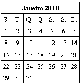 calendário do mês de Janeiro de 2010.