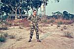 Alferes Oliveira em frente ao quartel do Alto Zaza, vendo-se ao fundo os edifícios pré-fabricados e o depósito de água. (Slide refª 501)