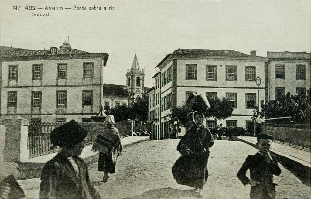 Aspecto do centro de Aveiro ainda com as duas pontes, por volta de 1915. À direita, a entrada da rua José Estêvão.