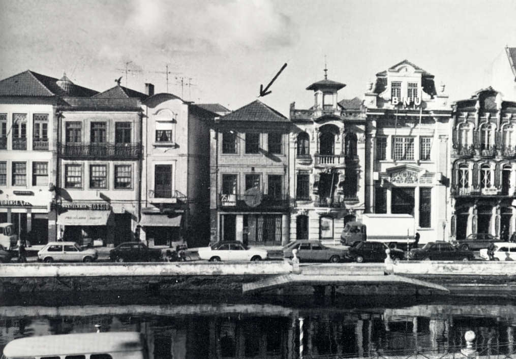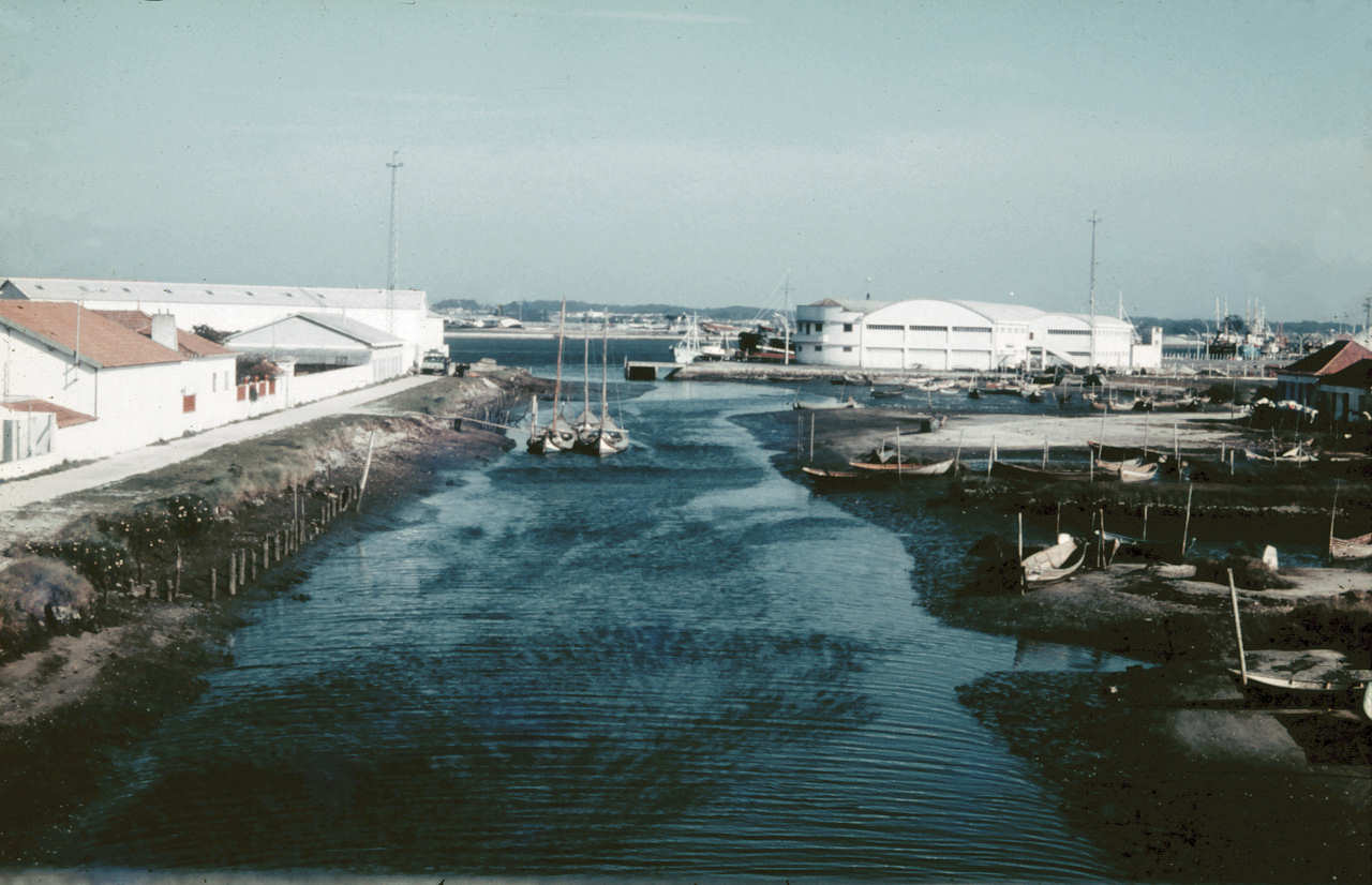 Reprodução de um diapositivo de uma colecção editada em 1973 pela Gulbenkian, mostrando como era a entrada do esteiro de Oudinot em 1972. À esquerda, as instalações da Empresa de Pesca de Aveiro. À direita, a firma Testa e Cunhas, Ldª.