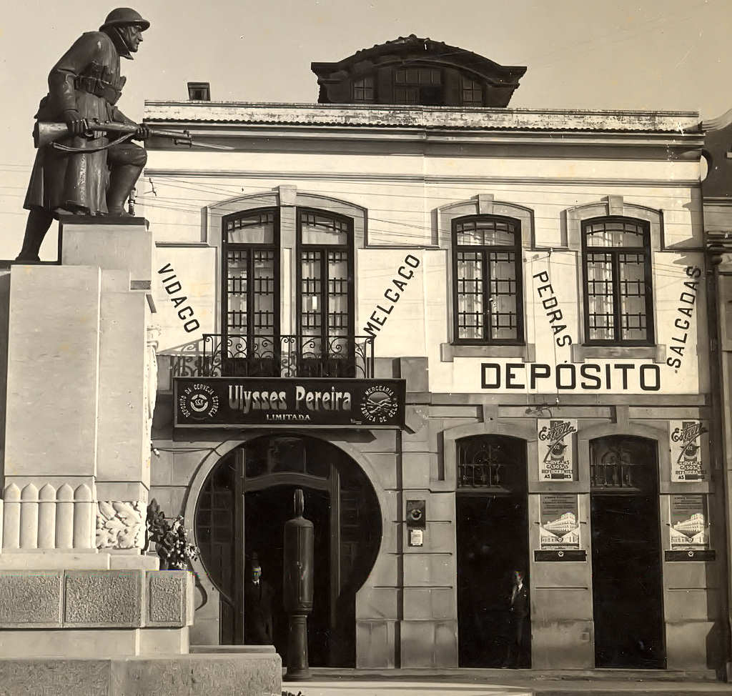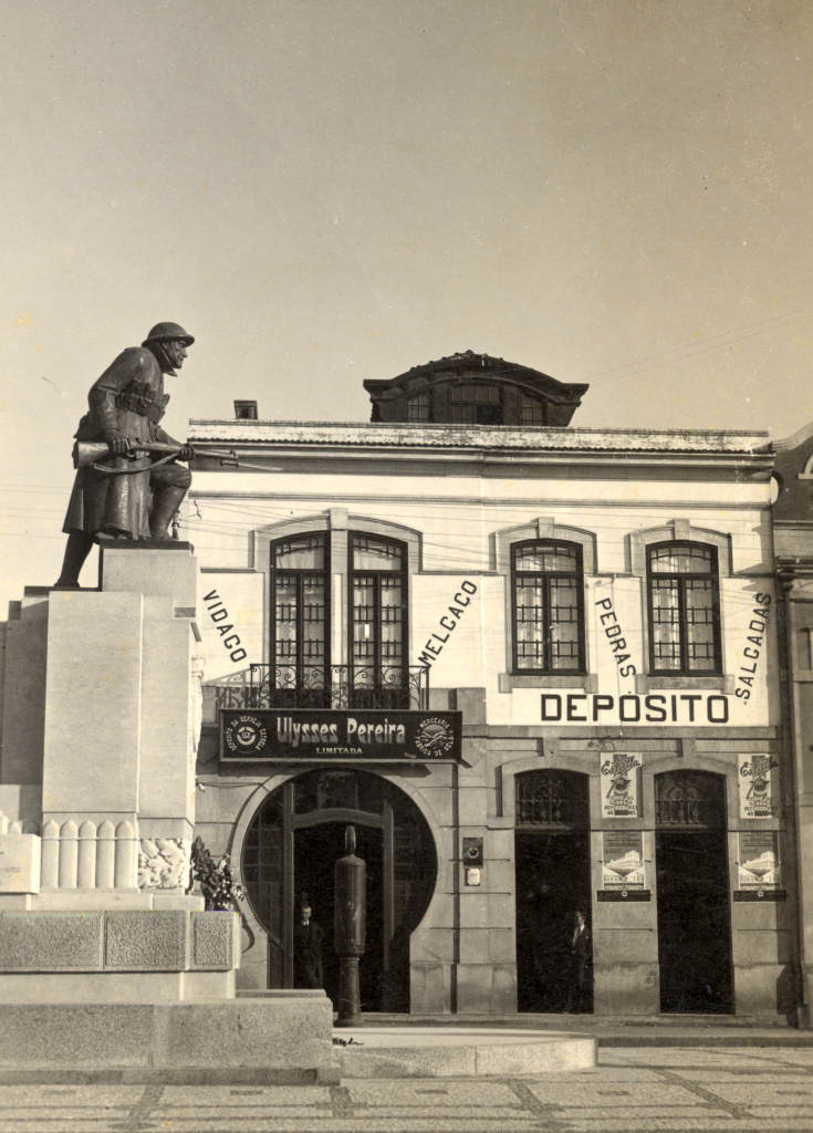Fotografia em formato 6x9 cm que nos mostra o Monumento aos Combatentes da Grande Guerra e, em frente, o depósito da firma de distribuição de bebidas Ulisses Pereira. Neste local está actualmente o Banco de Portugal.