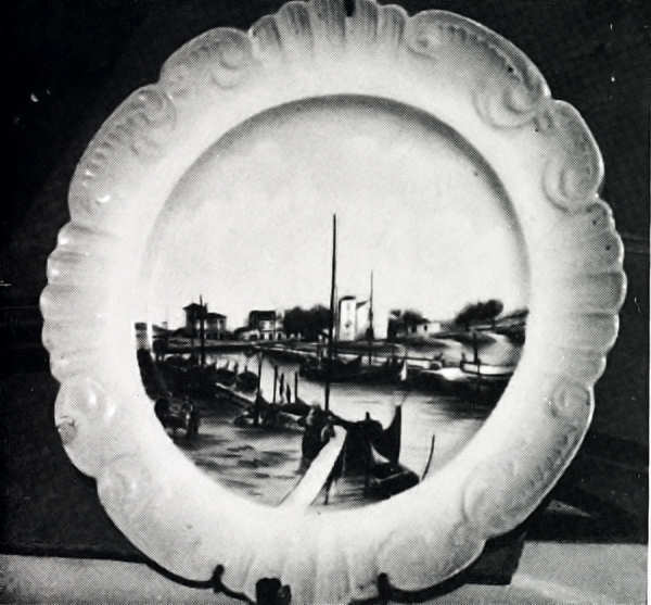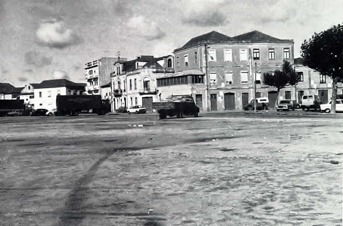 Vista parcial do Rossio, em fins do século passado, após o aterro da marinha de sal Rossia, que antes existira no mesmo local. (Reprodução de pintura da época em fundo de prato ornamental).