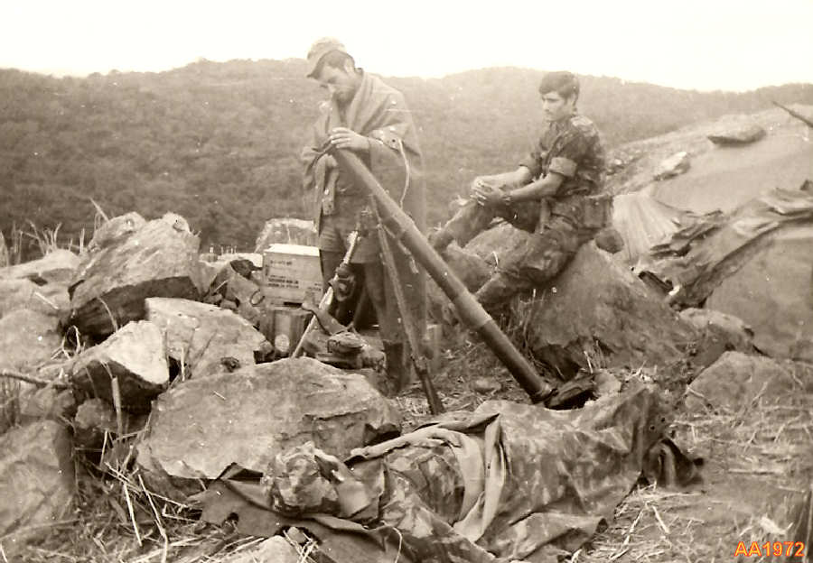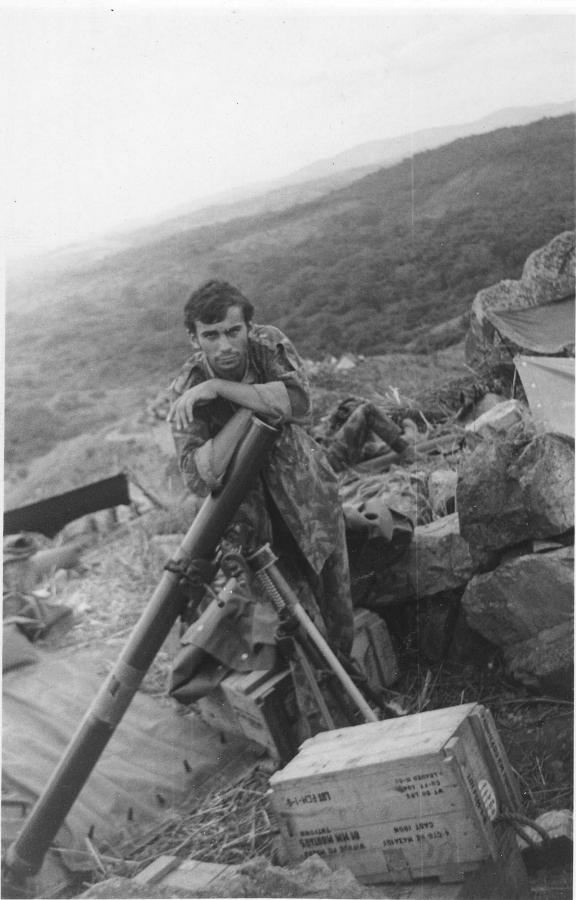 Posto de vigia, vendo-se, ao fundo, o acampamento. Na imagem, o dono da fotografia, apoiando-se num morteiro.