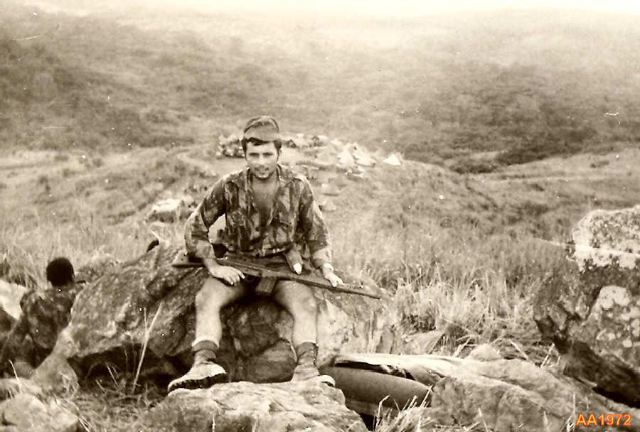 O dono da foto num morro, vendo-se ao fundo o acampamento de apoio a uma operação na região do Canacassala..