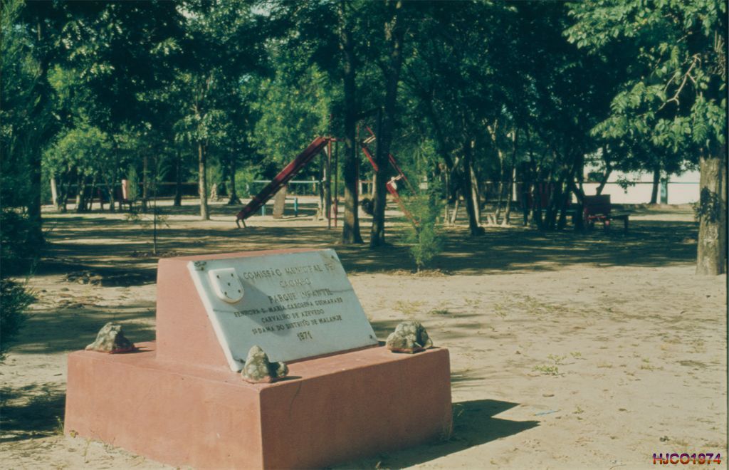 Aspecto do jardim de Caombo, vendo-se uma placa alusiva à sua inauguração com os seguintes dizeres: «Comissão Municipal de Caombo. Parque Infantil. Senhora D. Maria Carolina Carvalho de Azevedo. 1ª Dama do Distrito de Malanje. 1971»