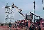 Trabalho de montagem dos novos depósitos de água, para abastecimento por meio de motor e canalização ligando o destacamento à zona de abastecimento de água. Trabalho de elevação do primeiro dos dois depósitos de chapa.  (Slide refª 1150)