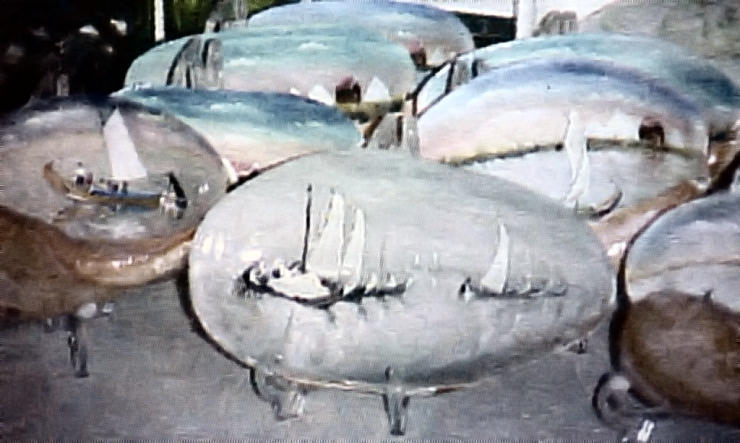 −, os pincéis, as latas de tinta e o produto acabado: as lindas conchas pintadas com motivos de Aveiro. Ao longo da