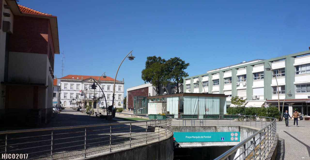 Aspecto da Praça Marquês de Pombal em 2 de Abril de 2017, vendo-se ao centro a entrada para o estacionamento subterrâneo.