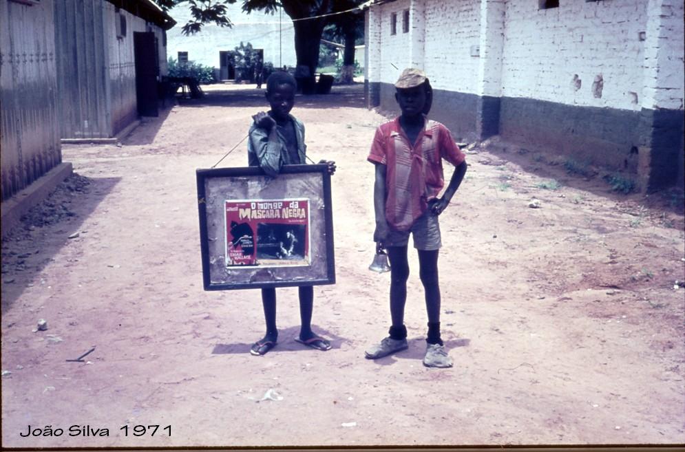 Anúncio do filme que passava no cinema de Montepuez, efectuado por dois miúdos, munidos respectivamente de um cartaz do filme e de uma sineta, para chamada de atenção.