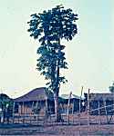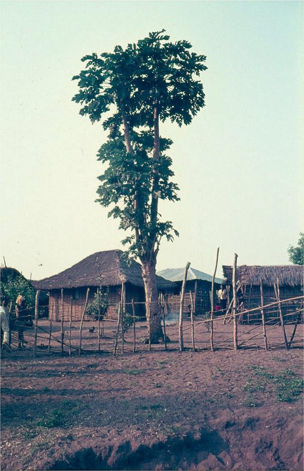 Uma das várias árvores de fruto existentes numa sanzala dos arredores de Quimbele. Neste caso, um mamoeiro, tendo, ao fundo, algumas cubatas da povoação. Arredores de Quimbele, sector de Uíje (Angola).