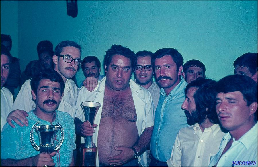 Fotografia tirada na messe de oficiais. Pessoal civil e militar,  após outra vitória da equipa de futebol de salão. Em primeiro plano, da esq. para a ditª: fur. Galvão, alf. Oliveira, um civil, cap. Alves, Mário e Torres. Vêem-se ainda as caras dos alferes Virgílio e Raimundo.