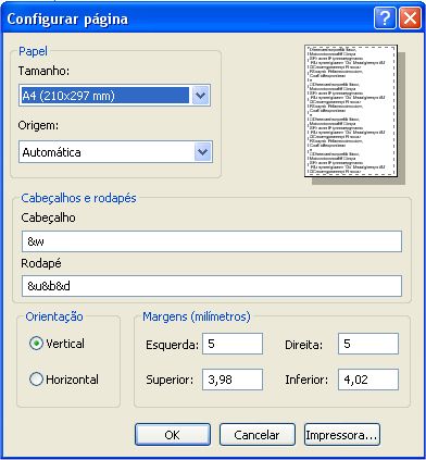 Para eliminarmos na folha impressa a indicação do número da página, deveremos seleccionar o campo «cabeçalho» e eliminar o «&w».