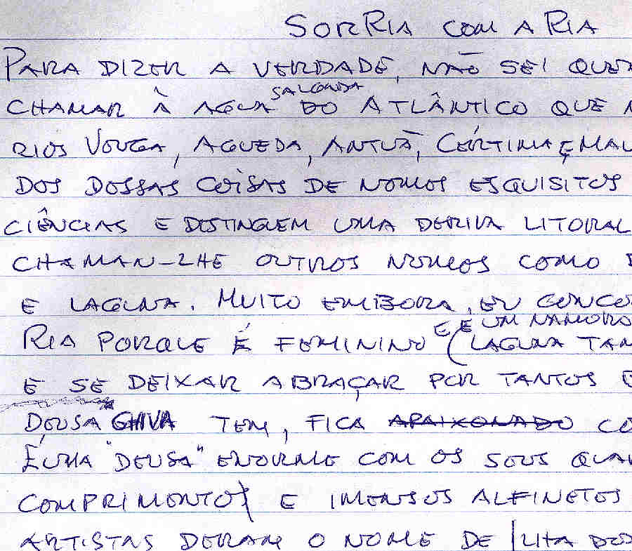 Sorria com a Ria Para dizer a verdade, não sei quem foi o padrinho que resolveu chamar à água salgada do atlântico que namora com a água doce dos rios Vouga, Águeda, Antuã, Cértima e Mau, Ria de Aveiro! Os entendidos dessas coisas de nomes esquisitos, subsidiências e outras ciências e distinguem uma deriva litoral, duma restinga ou de um delta, chamam-lhe outros nomes como Delta, Haff-Delta, Estuário e Laguna. Muito embora eu concorde com Estuário, prefiro Ria porque é feminino e é um namoro de muitos anos (Laguna também, mas…) e quem a navegar e se deixar abraçar por tantos braços, até mais do que a Deusa Chiva tem, fica com uma paixão e amor eternos. É uma “Deusa” enorme com os seus quarenta e sete quilómetros de comprimento e imensos alfinetes de peito com jóia a que os artistas deram o nome de Ilha dos Ovos, Monte de Farinha, Tostada Amorosa e outras pequenas missangas. Depois, aqueles brilhantes cristais que estão encastoados entre os caixilhos das marinhas e estas com as suas casinhas de brincar. E onde entre outros elementos está a bilha de barro que mata sedes ancestrais. Nos mencionados braços com nomes como Espinheiro, Cal do Ouro, Veia da Testada, Laranjo, Canal de Ovar, Canal de Mira, correm céleres as bateiras, os mercantéis e o símbolo mais belo que é o Moliceiro filho do casamento mar, ria. O mar queria tanto misturar-se com os doces rios que zangado rompia o hímen, ou seja, o cordão litoral, pois sabia que os homens e mulheres que labutavam pela sobrevivência dependiam física e economicamente desse casamento. Esse namoro prolongou-se ao longo dos séculos, pois em 1200 estendeu um frágil braço ali pela Torreira. Depois foi fazendo tentativas em 1500, 1584, 1643, 1737, 1756, 1762, 1778, 1802, 1838, até que o homem, munido de engenho e arte o ajudou definitivamente com proveito para as três partes. Finalmente, a 3 de Abril de 1808 celebrou-se o casamento indissolúvel e os burgos confinantes cresceram e olham fascinados os afilhamentos, produtos do matrimónio de uma “noiva” engrinaldada e um “noivo”, às vezes revoltado, mas que sem o seu trabalho incessante não lograria o sustento dos aveirenses, ilhavenses, vaguenses, murtoseiros e os outros mais pequenos irmãos nem permitiria rumar a outras paragens levando o que produziu e trazendo o que precisamos e, de há muito, desde o século XVI, o fiel amigo bacalhau. Por tudo isto, proclamo, declaro e grito: “Abençoada Ria!” Quem me dera que sejas o ataúde dos meus sonhos, pois amo-te para além do último sopro. 10-4-2008 Aveiro, Terra Salgada Quando se fala de Aveiro, uma tão velha quanto inadequada comparação é repetidamente evocada e que consiste em chamar-lhe Veneza portuguesa. Ora, a verdade é que não há proximidade alguma, quer estética, quer física, quer monumental entre estas duas cidades. Cada uma tem a sua personalidade e carácter próprios. Assim, desmistificada aquela ideia errática, é tempo de afirmar que, sem dúvida, Aveiro se apresenta como uma terra de água de singularidade única, com características próprias, bem vincadas, diferenciadas de todas as outras cidades deste nosso país. Considerados os dotes naturais,