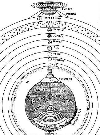 No poema alegórico-didáctico que é a “Divina Comédia“, obra máxima da literatura Italiana e que só mais tarde foi chamada Divina, Dante narra uma viagem imaginária na qual visita os Círculos Infernais, primeiramente guiado por Virgílio, seu Mestre, descendo até ao centro da Terra, onde reside Lúcifer, Príncipe dos Demónios. Daí, voltando à superfície do globo terrestre, sobe à montanha sagrada do Purgatório e agora, guiado pela sua amada Beatriz, chega ao Paraíso. Voa então pelos nove Céus até ao Empíreo e esta sublime viagem acaba na suprema e beatífica visão de Deus.