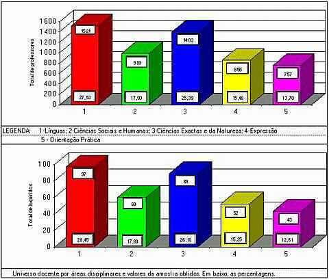por áreas disciplinares e níveis de ensino, e os valores da amostragem