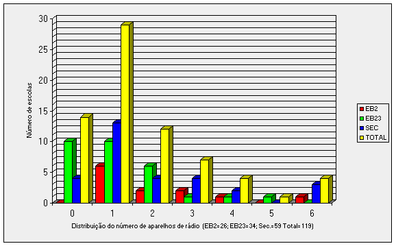 apenas 14 (19,72%) não possuem rádio. E o total de aparelhos, nas 57 escolas