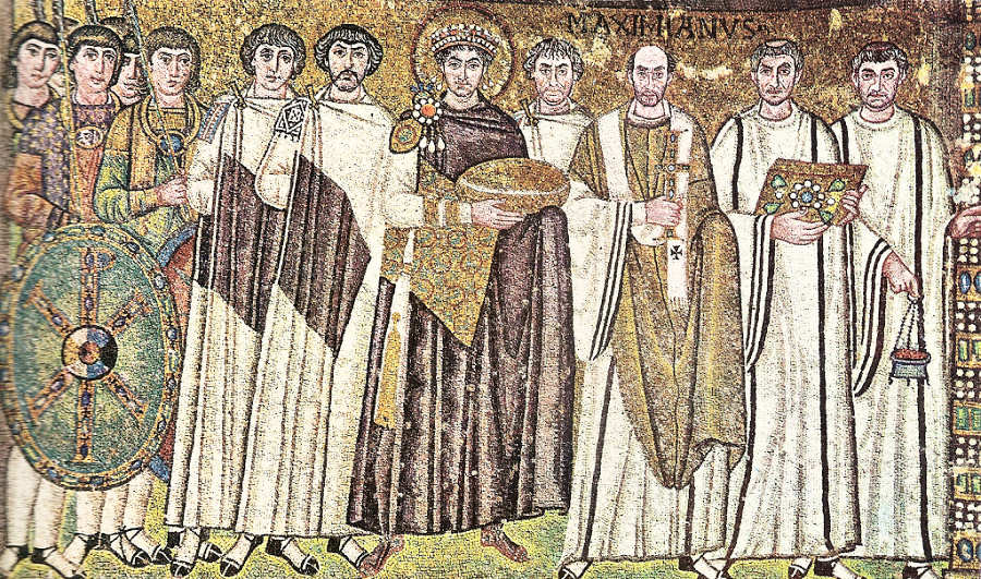 O Imperador Justiniano e sua corte, mosaico existente na igreja de S. Vital, em Ravena, de cerca do ano 547. O Imperador vai oferecer ao celebrante (Maximianus) o pão para a consagração (Eucaristia). Nesta cidade italiana se encontram outras preciosas igrejas desta época, nas quais abundam painéis de mosaico com temas de índole cristã.
