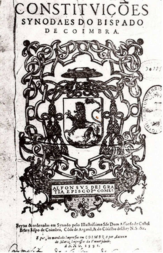 Constituições sinodais do Bispado de Coimbra, “feytas & ordenadas em Synodo pello Illustrissimo Sõr D. Affonso de Castel Brãco Bispo de Coimbra”, em 1591 (A. N., Pintura Maneirista em Aveiro, pg. 62).