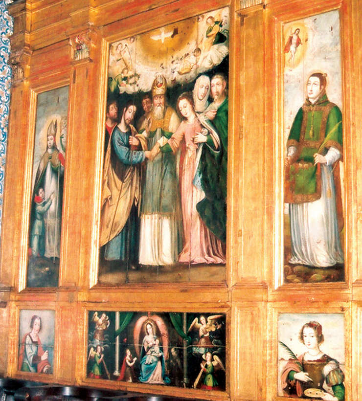 Casamento da Virgem e S. José, ladeado por S. Brás (esq.) e Santo Estêvão (dir.); na predela, S. Apolónia (esq.), Nossa Senhora do Leite (centro) com quatro anjos músicos, e S. Luzia (dir.).