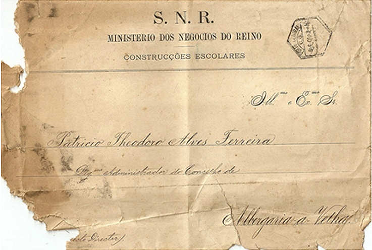 Envelope que serviu para a troca de correspondência entre o director das Construções Escolares da Direcção-Geral do Ministério do Reino, Adães Bermudes, e o Administrador do Concelho de Albergaria-a-Velha, Patrício Theodoro Álvares Ferreira, datado de 6 de Junho de 1901[21]