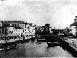 Canal Central e centro da cidade, em 1870, vendo-se, à esquerda, algumas barracas da Feira de Março, realizada no Largo do Rossio.