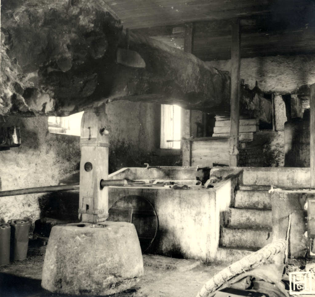 Dividida em três zonas distintas, a que correspondem os três pontos principais de uma alavanca do tipo já mencionado(13), a vara é quase sempre encaixada na parede. Esta, construída com enormes blocos de pedra e de considerável largura, para melhor suportar as enormes pressões exercidas verticalmente de baixo para cima pelo feixe, apresenta uma cavidade de secção aproximadamente quadrada, bem delimitada por dois maciços blocos de pedra. As dimensões destes blocos variam muito de lagar para lagar. Colocados vertical e paralelamente, sobressaem do plano da parede alguns centímetros.