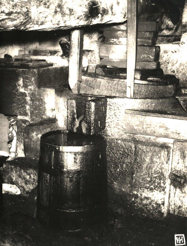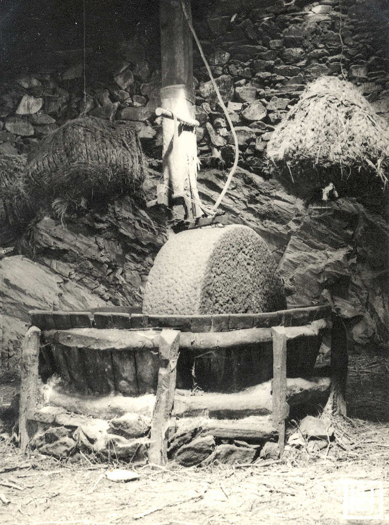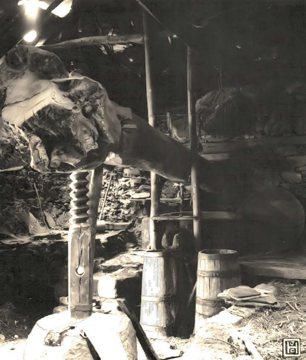 Fig. 152: Aspecto do lagar de Varrelas, freg. Carvalho, conc. Penacova., dist. Coimbra. Ao centro, entre as tarefas, a fornalha, dotada de uma chaminé.