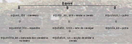 3 No texto analisado, In foro, surge a expressão statuae ... equestres. Equestres é um adjectivo (equester, tris) que se encontra no nominativo do plural, concordando com o substantivo statuae. Este adjectivo faz parte de uma numerosa família de palavras, provenientes da palavra primitiva equus, i.