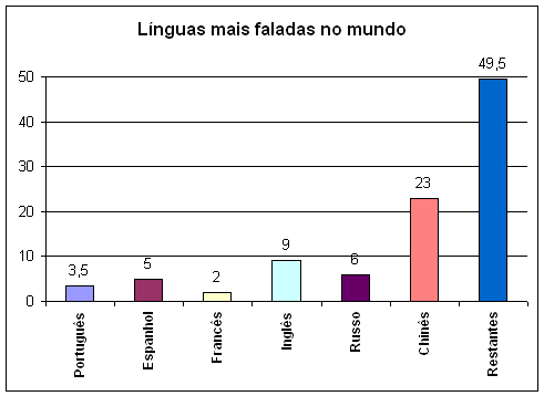 Línguas mais faladas no mundo: Chinês 23 %, Inglês 9 %, Russo 6 %,