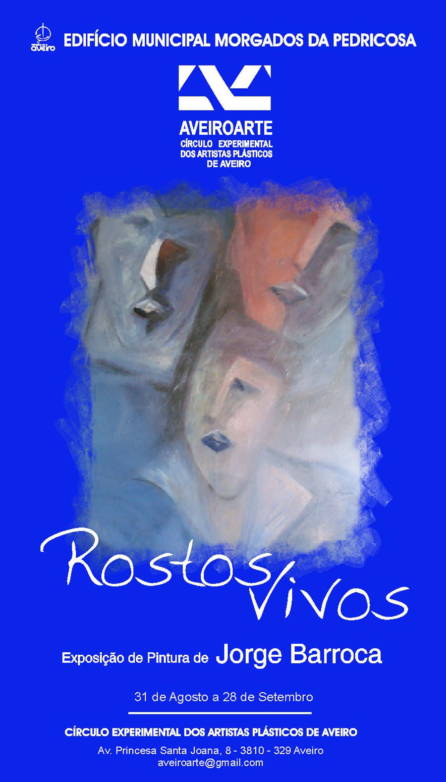 A Câmara Municipal de Aveiro e a Direcção do AveiroArte convidam V. Exª e Família para a inauguração da Exposição de Pintura “Rostos Vivos” do Artista Plástico Jorge Barroca, que decorrerá na quarta-feira dia 31 de Agosto, pelas 21.30 horas, na Galeria do AveiroArte (junto ao Museu de Aveiro) no edifício Municipal Morgados da Pedricosa - Avª Stª Joana, nº 8 - Aveiro.