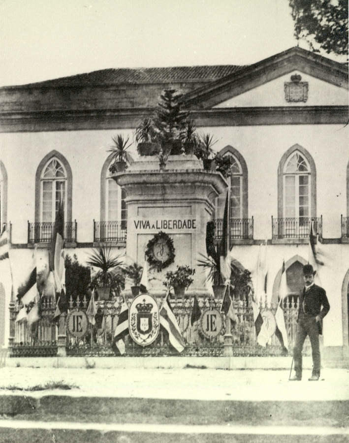 Pedestal aguardando a colocação da estátua em bronze, tendo por detrás o edifício do então Liceu de Aveiro, que se ficou a dever a José Estêvão.