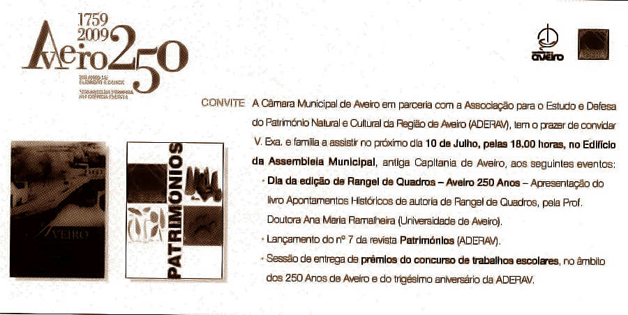 Com o objectivo de fomentar a envolvência dos jovens nas questões da valorização do Património e da História de Aveiro, através da sua participação em trabalhos escolares que reforcem a ligação à matriz identitária aveirense valorizando em especial o Património histórico, artístico e cultural do concelho de Aveiro, a ADERAV e a Câmara Municipal de Aveiro organizaram um concurso no âmbito das comemorações dos 250 anos da cidade de Aveiro e do trigésimo aniversário da ADERAV.