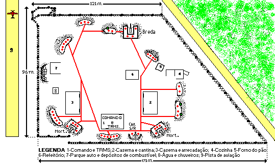 No fim da manhã, tínhamos todos os dados para a elaboração de um plano de defesa. Com todas as medidas, fiquei a saber que o destacamento apresenta uma área muito considerável, com a forma de um trapézio rectângulo. A base maior, em frente ao comando e na zona do campo de futebol, tem 175 metros; a menor, 121 metros; o lado perpendicular às bases, situado do lado da pista de aviação, tem 96 metros; o lado oposto, oblíquo, situado na zona da cozinha e ao lado de uma picada, tem 107,5 metros.