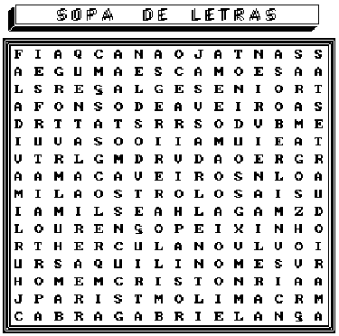 No quadro da sopa de letras encontras 12 figuras ligadas a Aveiro, entre as quais a pessoa homenageada. Se tiveres dificuldades, consulta as soluções para melhor as localizares. Além dessas 12 figuras, encontrarás também 8 nomes ligados à literatura portuguesa e ainda 13 cidades europeias. Se quiseres, envia para «A FOLHA» um trabalho no qual identifiques essas 12 figuras ligadas a Aveiro. Para isso, deverás indicar o período em que viveram (nascimento e morte) e a razão pela qual se distinguiram. O melhor trabalho será publicado e premiado.