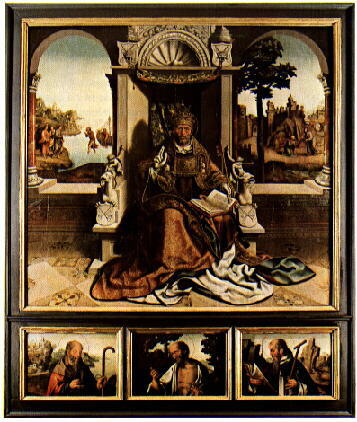 Quadro do Museu Grão Vasco com a representação de S. Pedro. A seguir, pormenores dos três painéis inferiores.