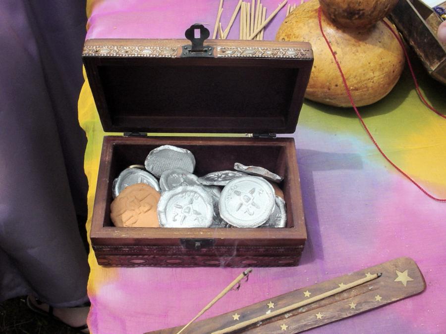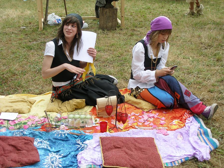 um vestido à luz das tendências medievais, vende bolos e doces, rodeada