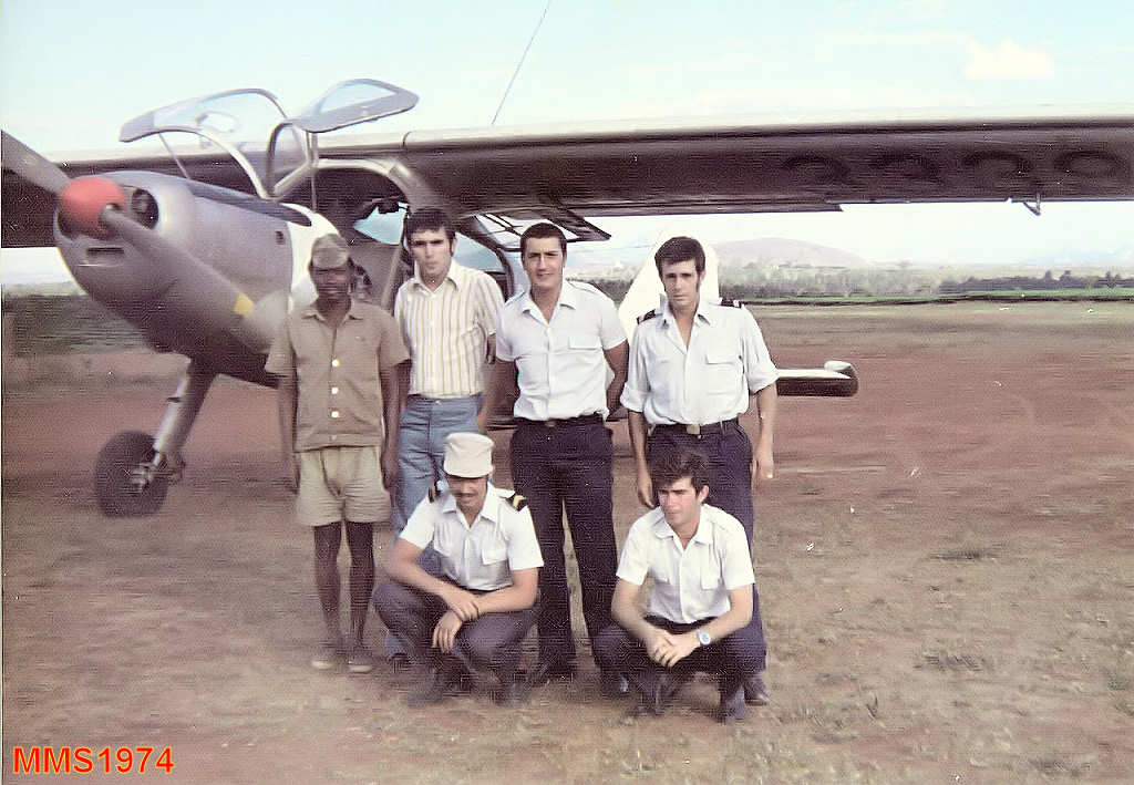 Passeio à terra do chá, ou seja, a Vila Junqueiro, no DO 27, a pedido dos militares da foto e do fotógrafo desta imagem ao comandante Geada. Nesta foto sou o fotógrafo. Os nomes dos especialistas com divisas: em cima, Simões; em baixo Abreu, o africano, que era o guarda da pista, um civil cujo nomes está olvidado. Os militares sem divisas eram os condutores do comandante.