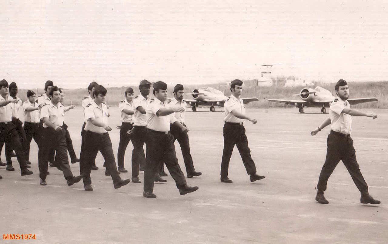 Desfile na linha da frente do AB6. Esta foto cedida por Manuel Marques da Silva foi tirada pelo ex-alferes Moreira.