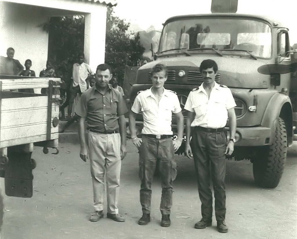 Da esq.>drt.: civil (machambeiro), cujo nome está esquecido, M. M da Silva, o 1º sargento. Sequeira (ou Cerqueira?). Atrás, o transporte militar utilizado nas compras para a messe em linha de vista c/ a Base.